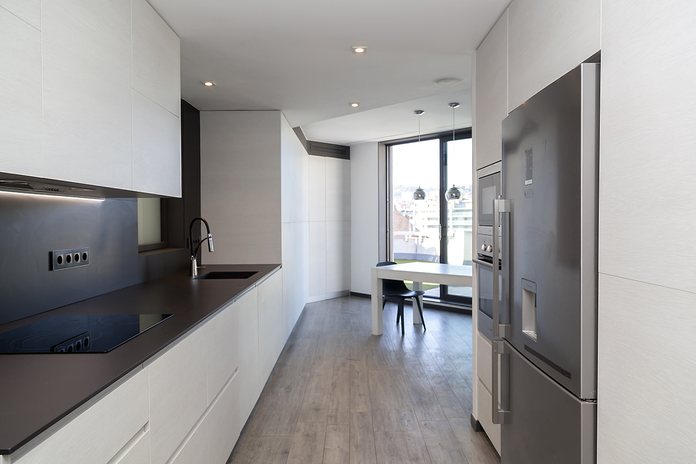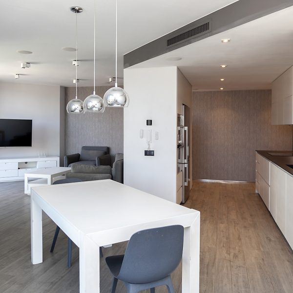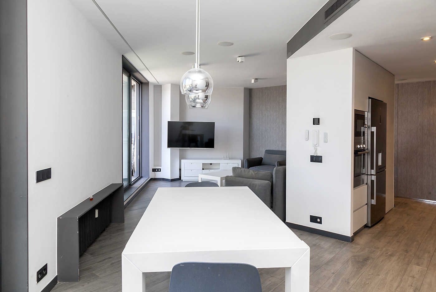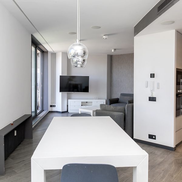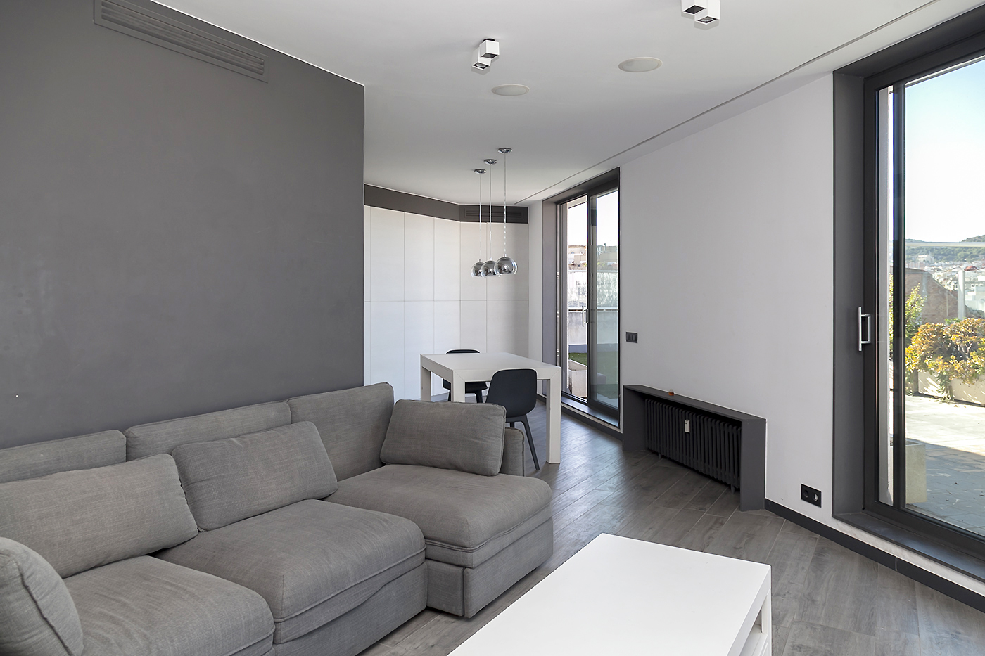 Entrando el recibidor divide el piso en dos zonas independientes. La primera alberga la vivienda principal, compuesta por un amplio salón-comedor y una cocina abierta situada en el centro del espacio, que aporta un ambiente cálido y acogedor. Desde esta zona se accede a una espectacular terraza de 50 m², soleada y completamente privada, con vistas directas e impresionantes a la Sagrada Familia.