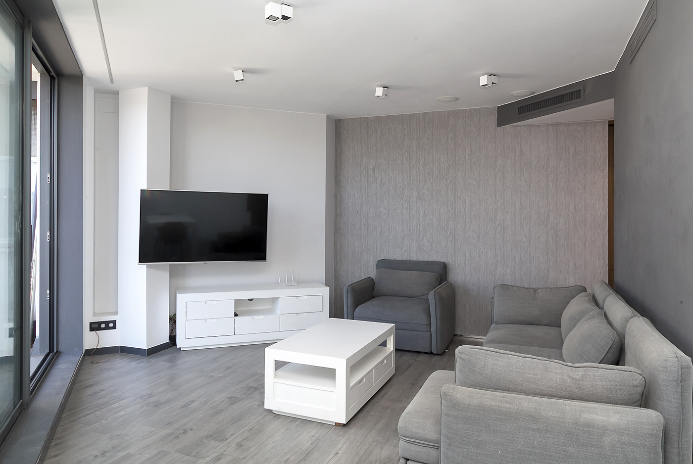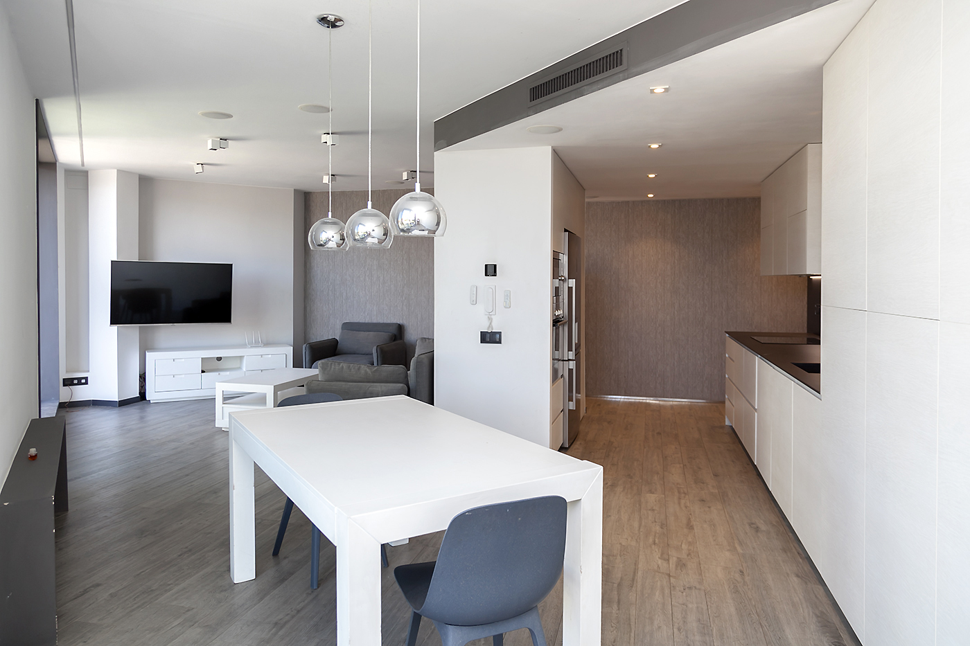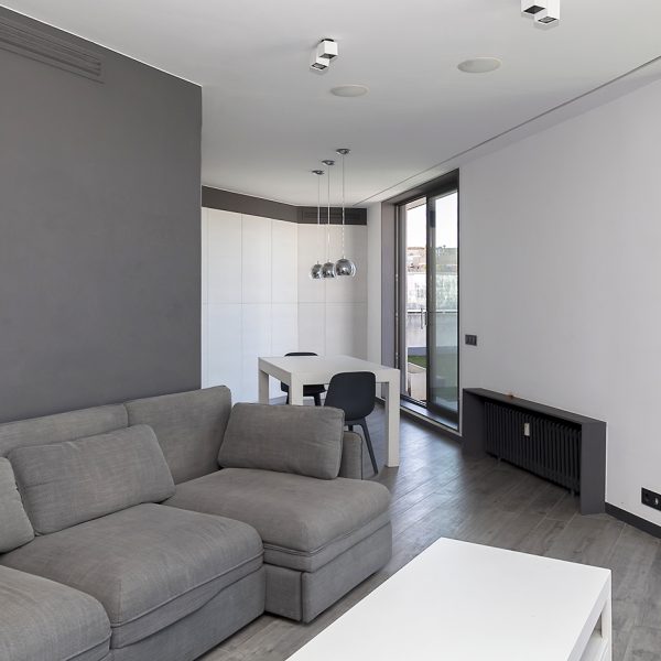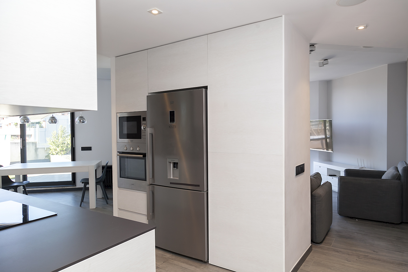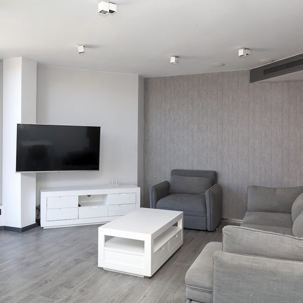 Entrando el recibidor divide el piso en dos zonas independientes. La primera alberga la vivienda principal, compuesta por un amplio salón-comedor y una cocina abierta situada en el centro del espacio, que aporta un ambiente cálido y acogedor. Desde esta zona se accede a una espectacular terraza de 50 m², soleada y completamente privada, con vistas directas e impresionantes a la Sagrada Familia.